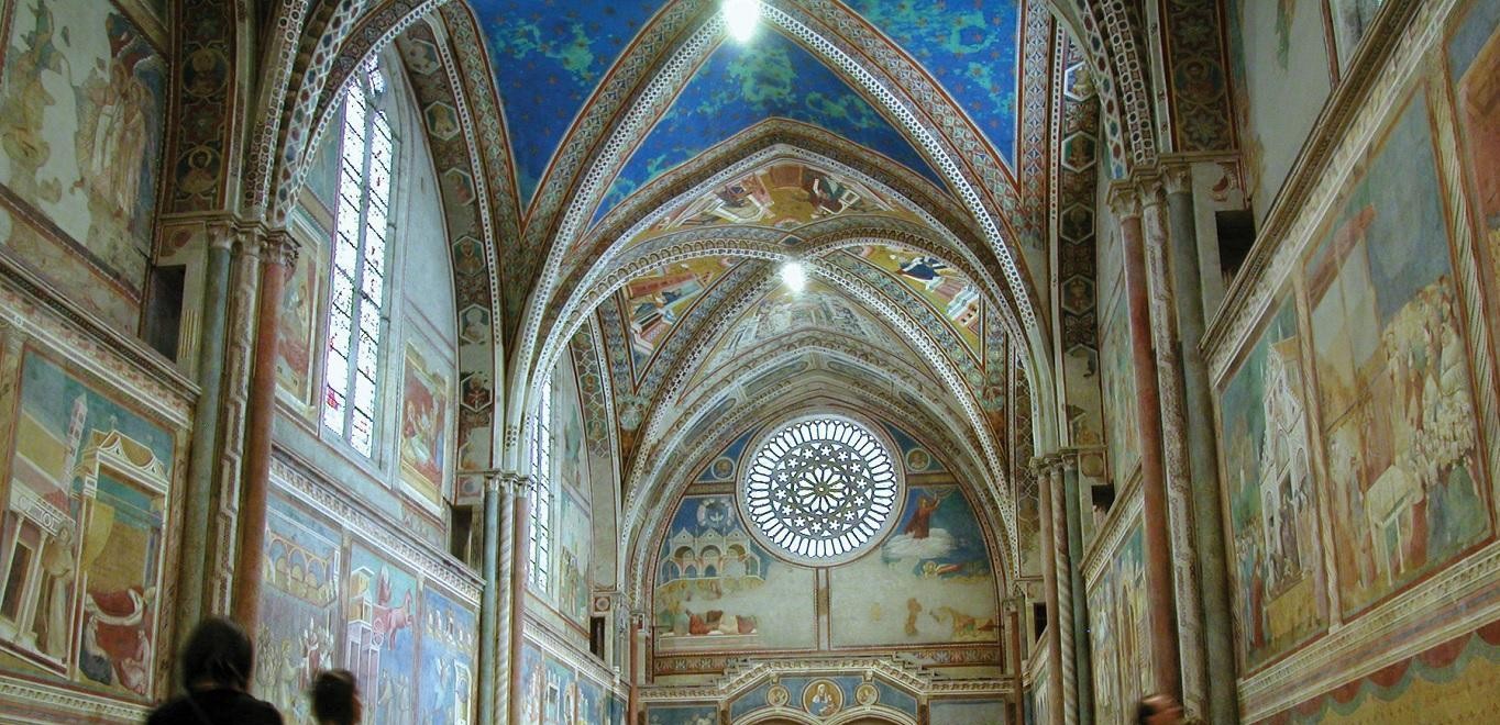 ジョットはアッシジのサン・フランチェスコ大聖堂上堂で一連のフレスコ画を制作しました。28の区画で、だまし絵のロッジアの中に、聖人の生涯を若き日から死に至るまで描いています。現実の生活への関心は、登場人物の描写や環境の描写に明らかであり、そこには実際に存在する建物が描かれています。また、登場人物の衣服も当時のものであり、当時の信者が教会に入ったときに、描かれた観客のように、その場面に感情移入できるように意図されていました。