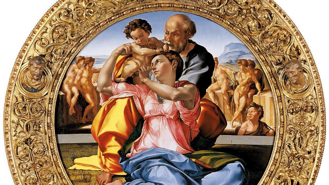 また、この時期にミケランジェロは『トンド・ドーニ(ドーニ家の円形画)』(別名『聖家族と幼子洗礼者ヨハネ』)を描きました。これは商人アンジェロ・ドーニとマッダレーナ・ストロッツィの結婚を記念して依頼されたもので、17世紀以降、ウフィツィ美術館の「トリブーナ」と呼ばれる部屋に展示されています。